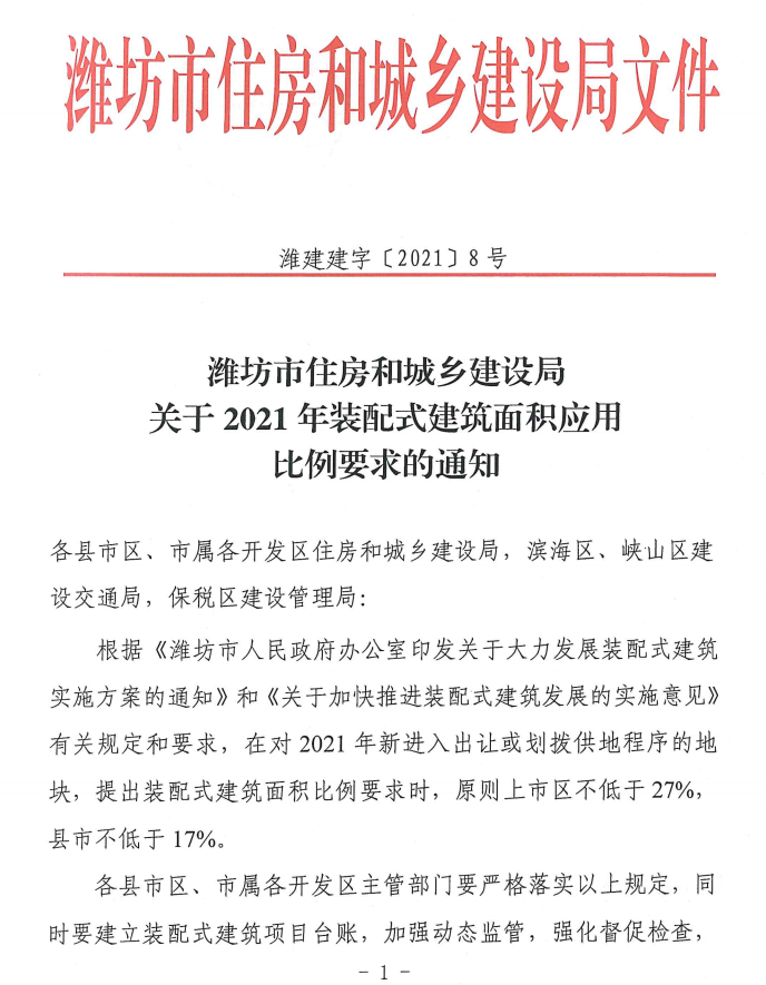 山东潍坊市住建局关于2021年装配式建筑面积应用比例要求的通知