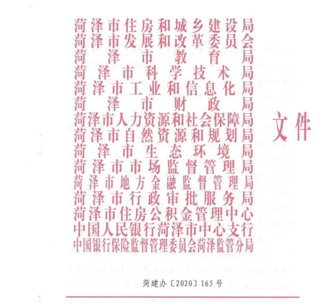 各县(区)住建局、发改局、教育(教体)局、科技局、工业和信息化局、财政局、人力资源社会保障局、自然资源规划局、生态环境局、市场监管局、地方金融监督管理局、行政审批局,人民银行(菏泽市)各县区支行、分管营业管理部,菏泽银保监分局各县区监管组,住房公积金管理中心各县区管理部,开发区、高新区建设局,牡丹区、曹县建筑工程服务中心,各银行机构,各有关单位∶
